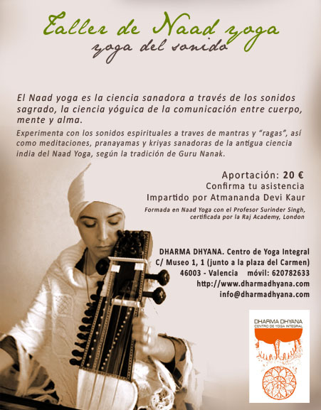 Periódicamente ofrecemos Talleres Naad Yoga la ciencia del sonido, desde la tradición del Shabad Guru, las enseñanzas de Guru Nanak y la tradición sij. Aprenderemos a utilizar los sonidos sagrados y sus cualidades terapéuticas, desarrollando la escucha, voz, la respiración, afinar tus pensamientos, emociones, todo tu cuerpo ..., para comunicarte con tu ritmo interior y transformar tu vida radicalmente. No es necesaria experiencia previa. Impartida por Atmananada Ravi Harnal Kaur, profesora de Naad yoga formada con el Prof. Surinder Singh de la Raj Academy. Los talleres se realizan en sábado, de 10 a 13 h. A confirmar próxima fecha. Aportación de 20 € Es necesario confirmar asistencia. ![]()